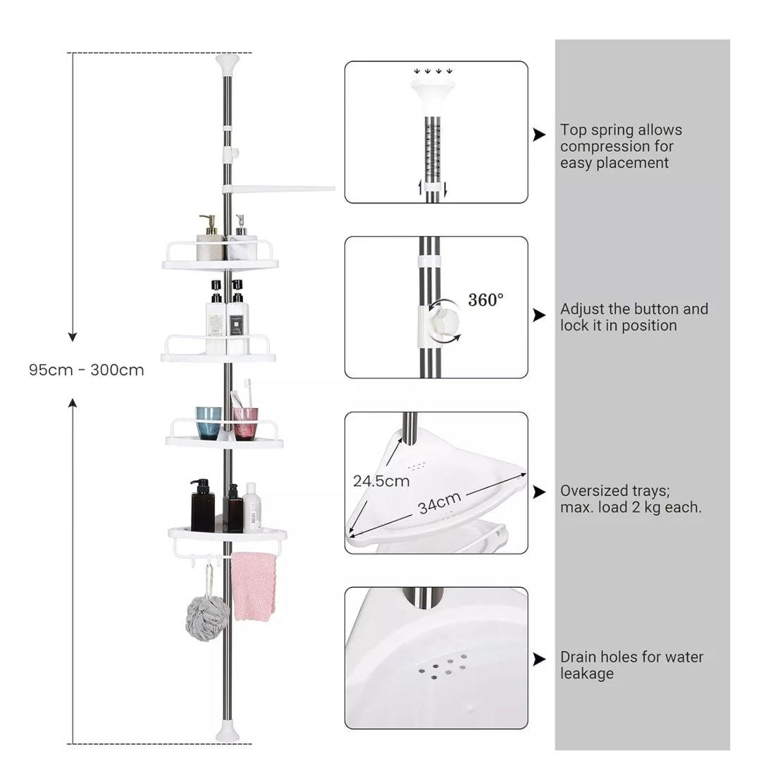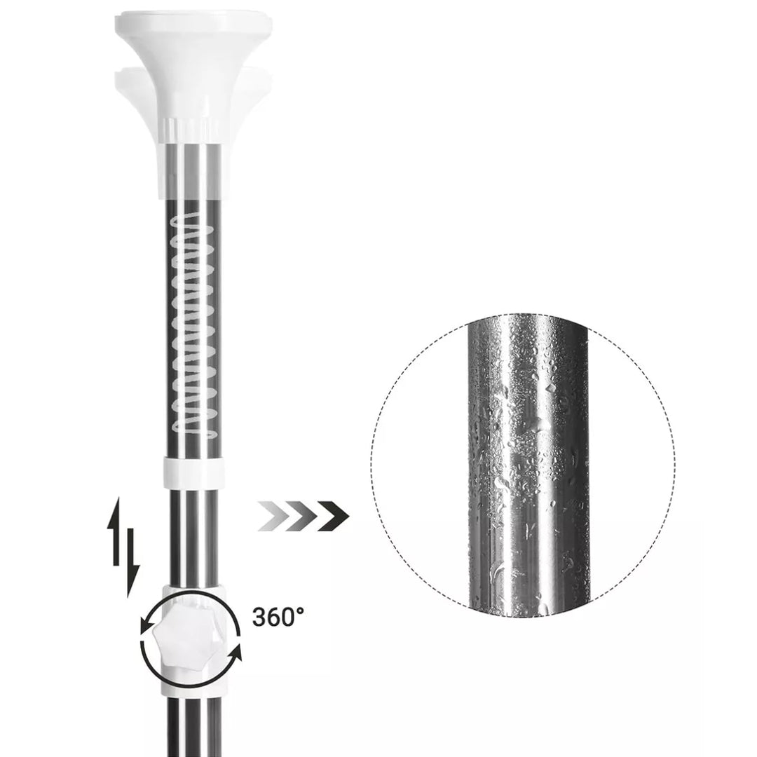 Fácil Instalación: Montar este organizador es un juego de niños. No se requiere perforación. Simplemente ajusta el poste telescópico entre el suelo y el techo, o si prefieres, sobre el plato de ducha o bañera. Su diseño flexible te permite personalizar la organización según tus preferencias.