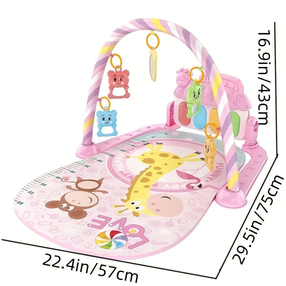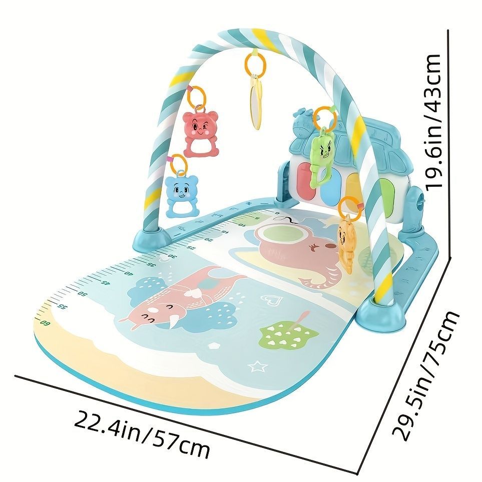 -Estera de tela suave con un lindo colgante de dibujos animados con un piano multicolor que atrae la atención del bebé.
